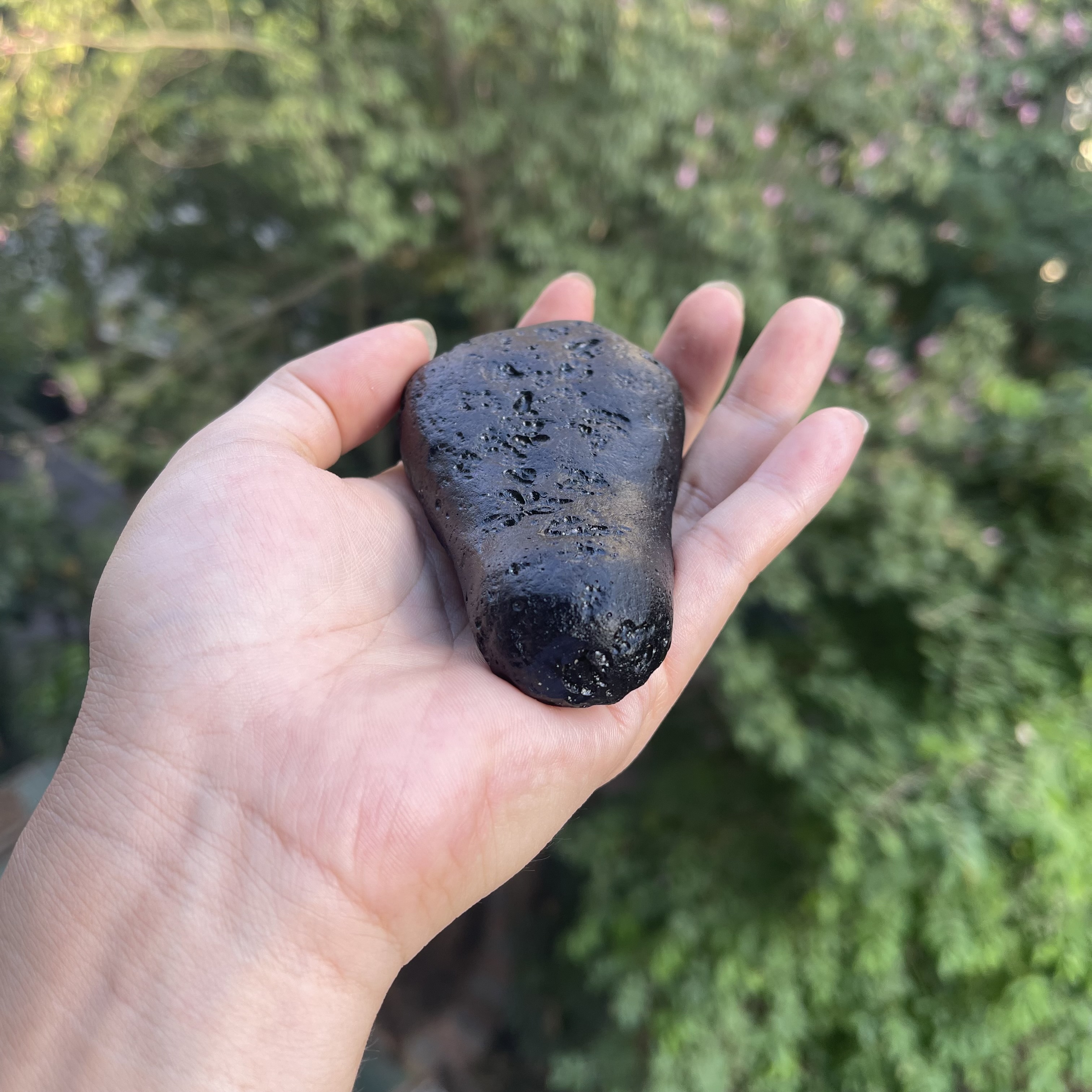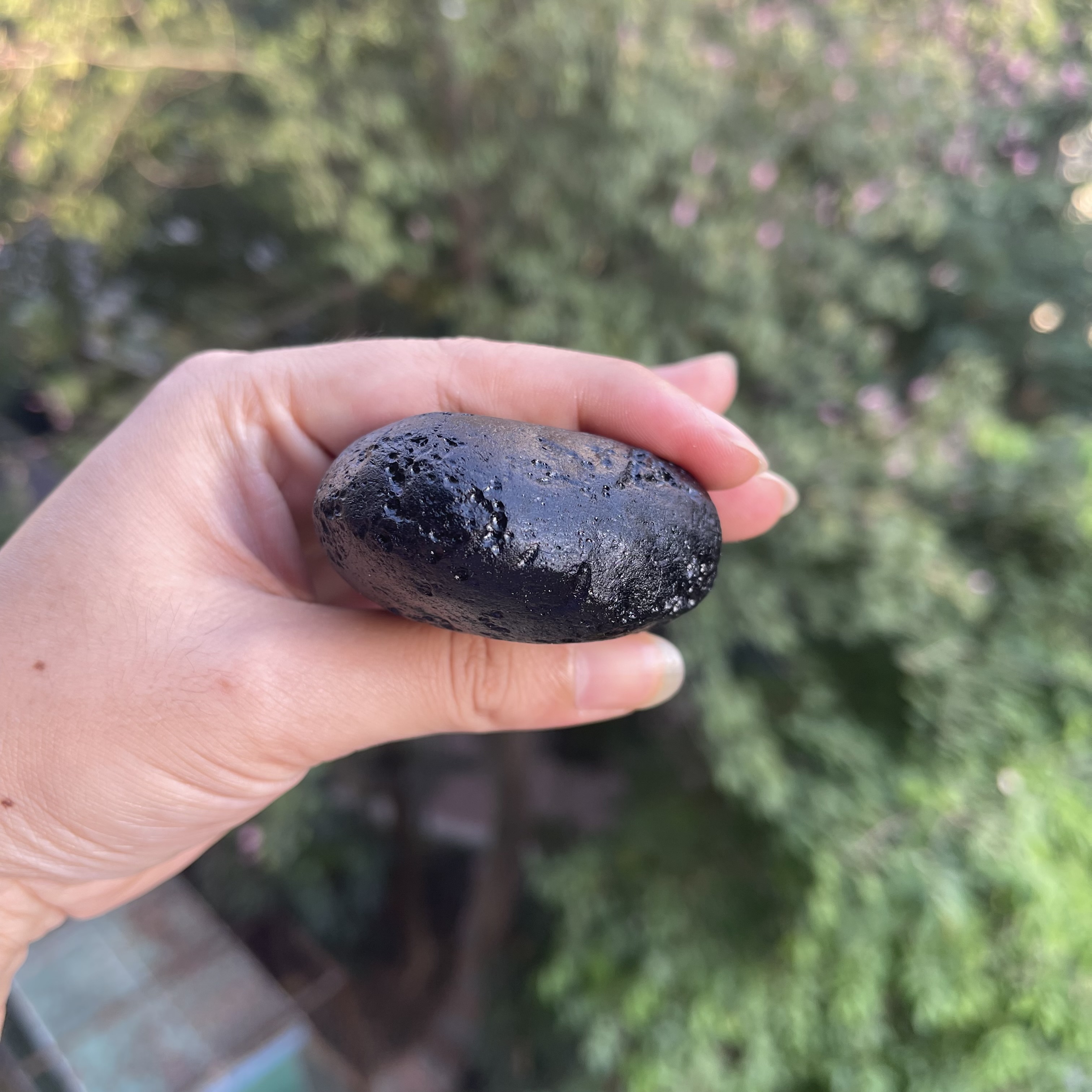 观音牌玻璃陨石雷公墨,一颗精美的手把件原石,重约206克。