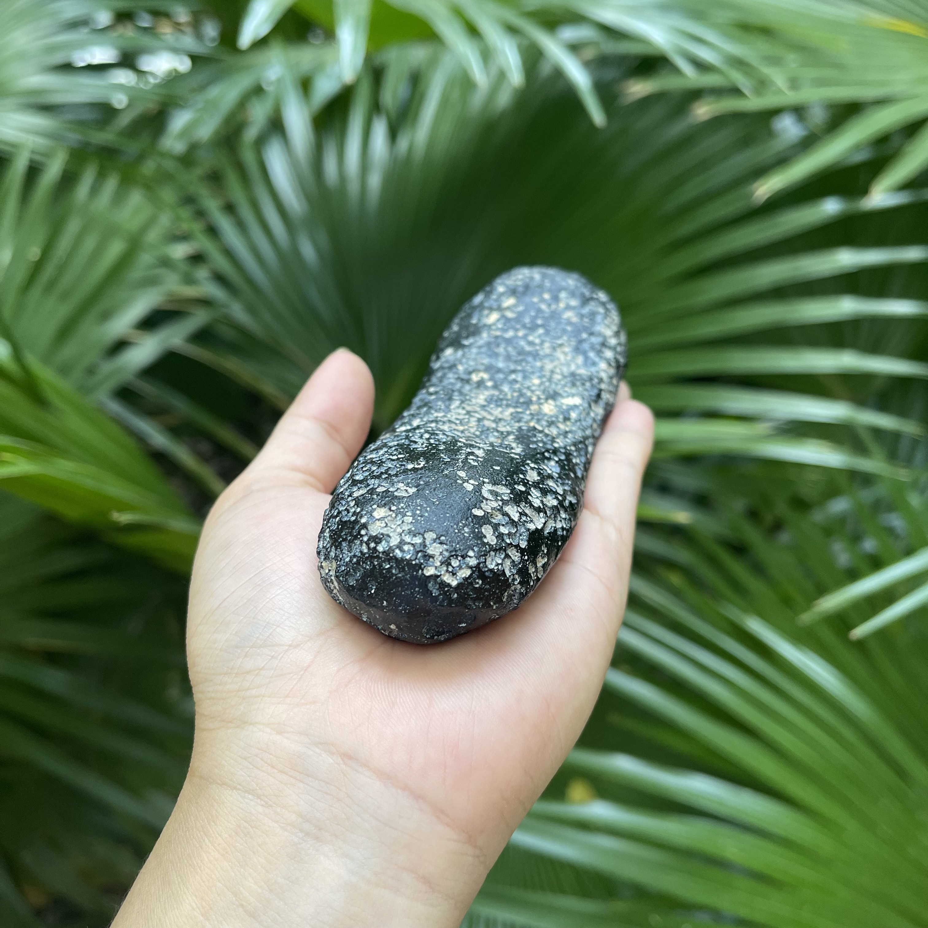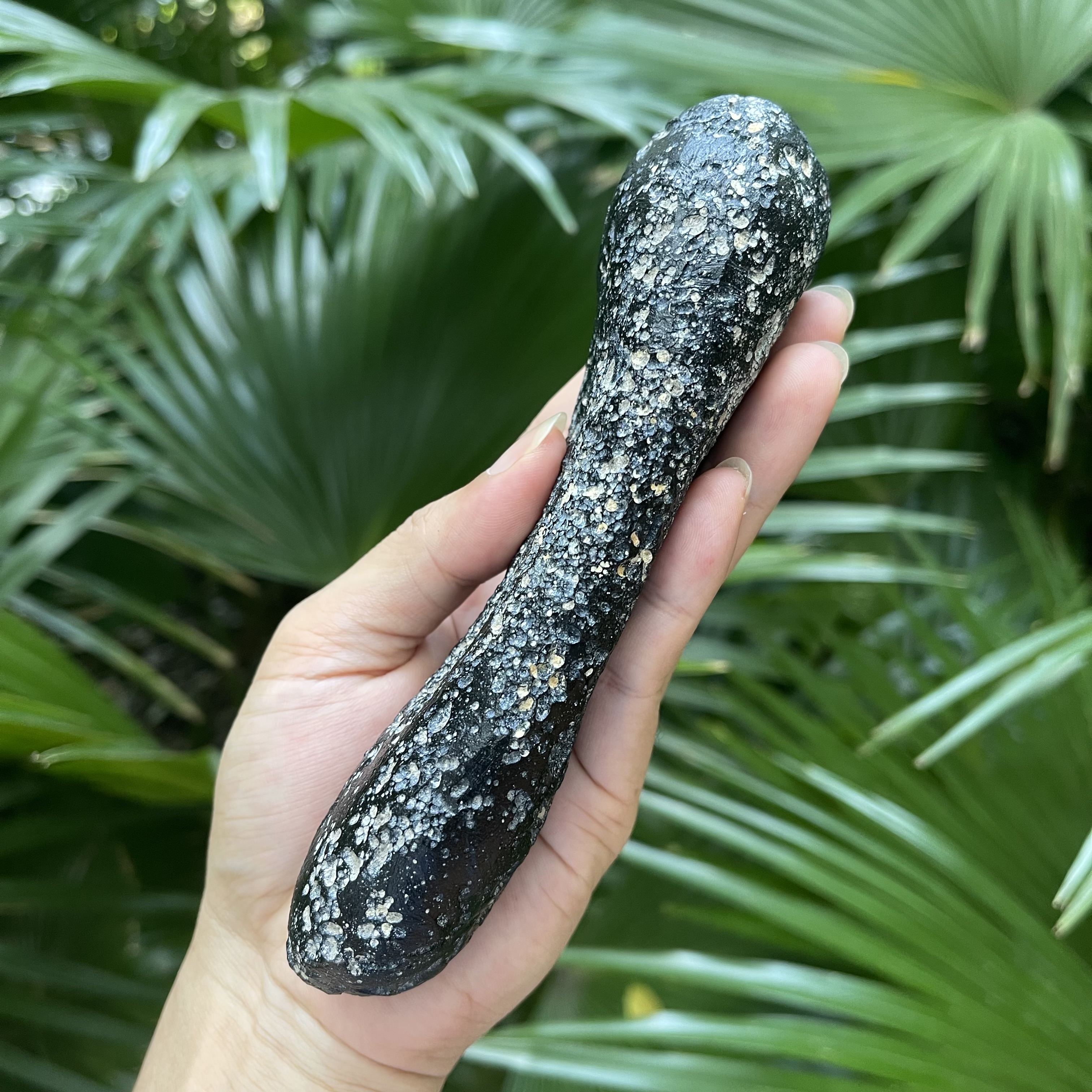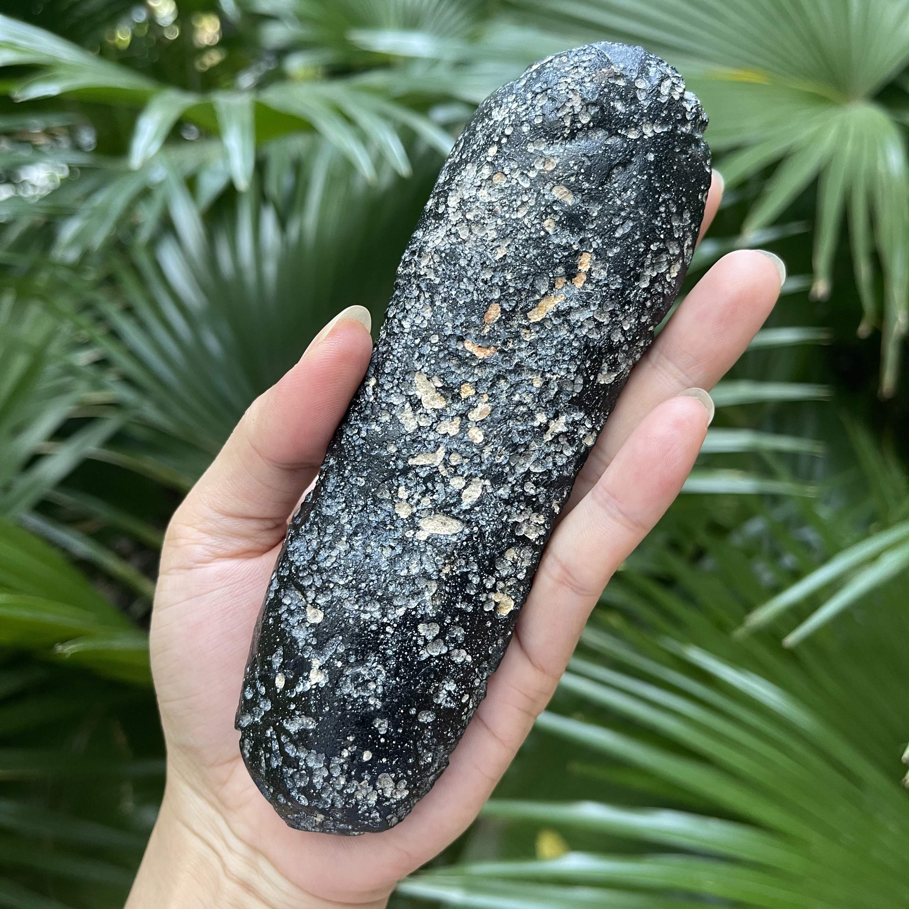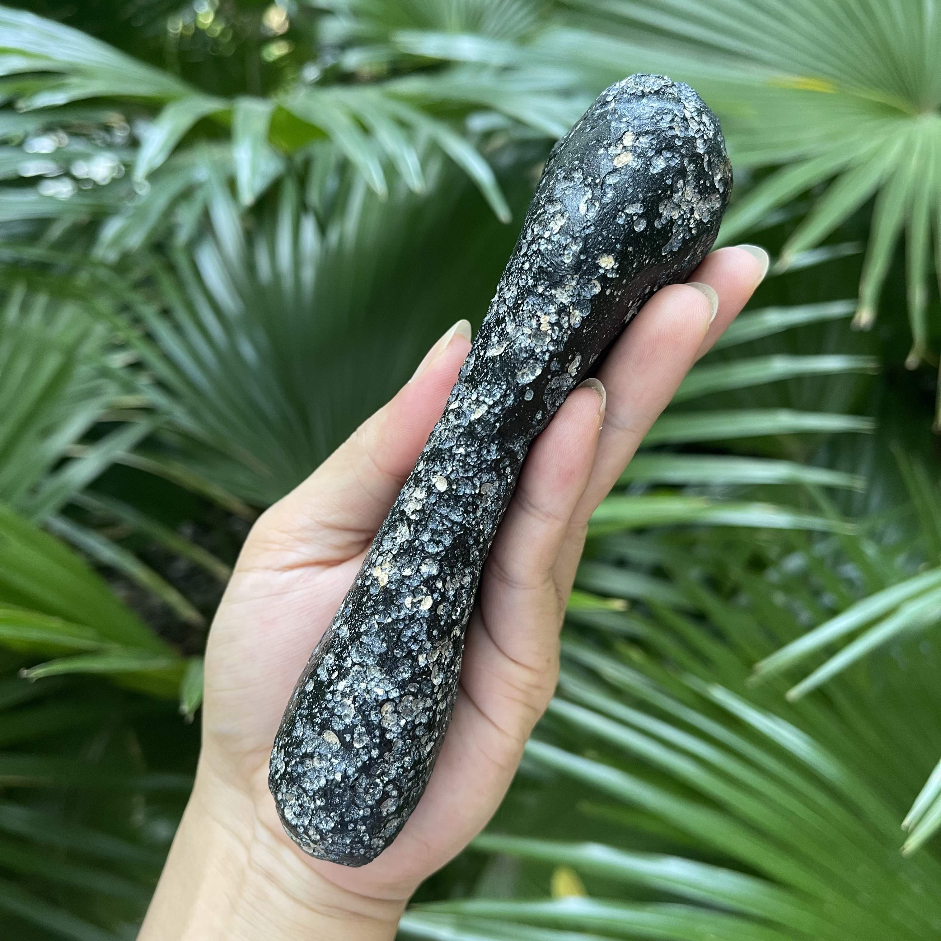 如意形状的玻璃陨石雷公墨大长条,出土于茂名露天矿,其特征是表面附有白泥矿,表皮显油性光泽,其长度约16公分,重量约336克,这个长度与重量的玻璃陨石雷公墨是非常罕见的存在。